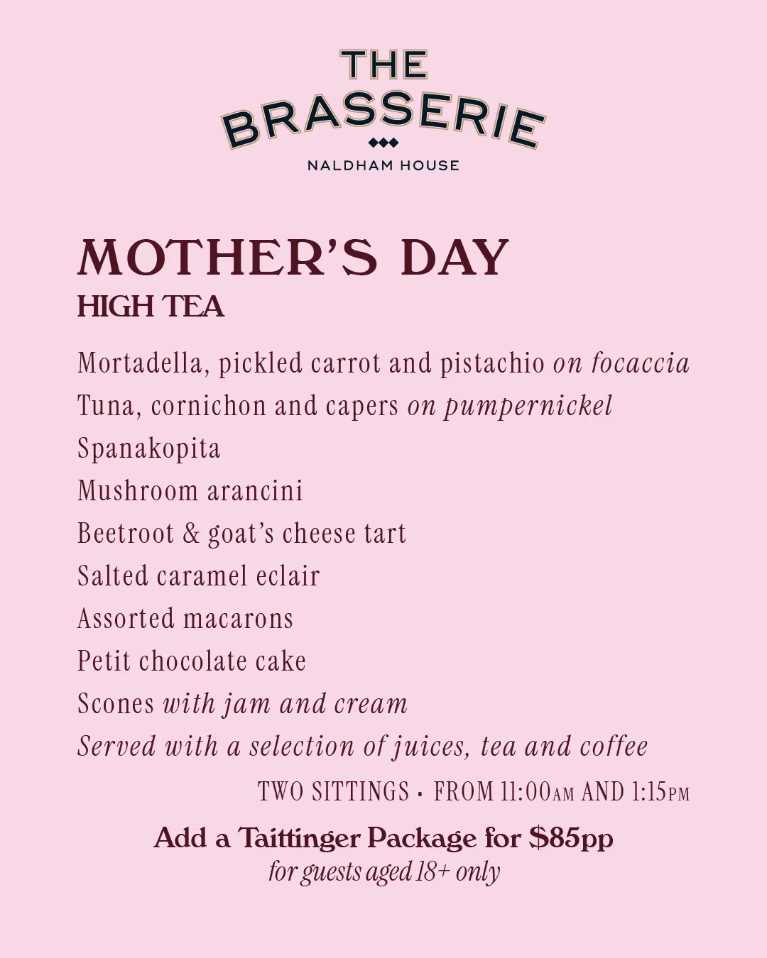 Celebrate Mum in style at The Brasserie at Naldham House with our delightful Mother’s Day High Tea. Nestled in the elegant heritage surroundings of Naldham House, this special occasion treats her to an afternoon of delicate pastries, freshly baked scones, and a selection of fine teas, all served in a warm, inviting atmosphere. With charming touches, sparkling bubbles, and plenty of sweet moments to savour together, it’s the perfect way to show Mum just how loved she is